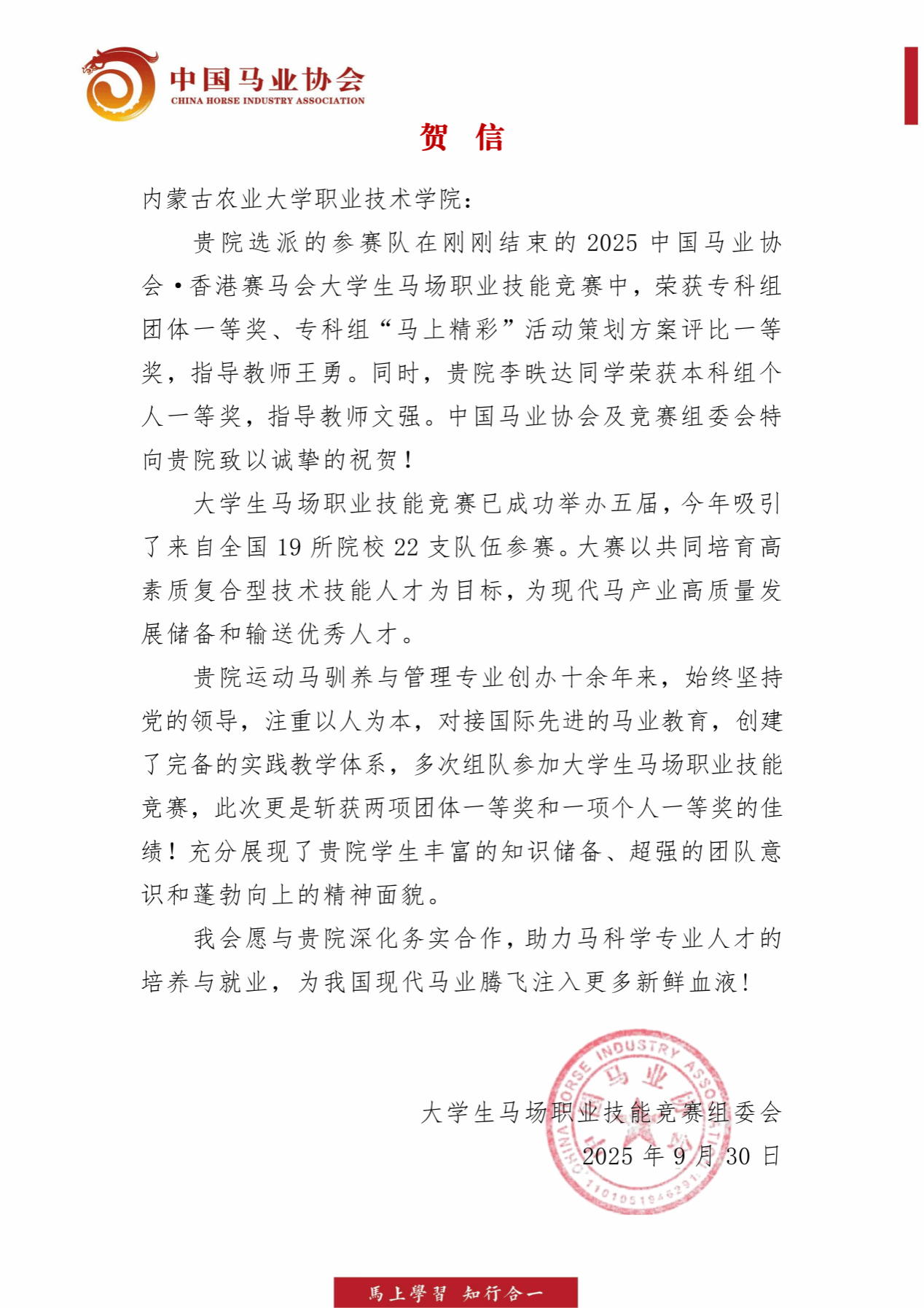 中国马业协会特此向学院载誉归来的全体参赛队员、指导教师表示最热烈的祝贺。