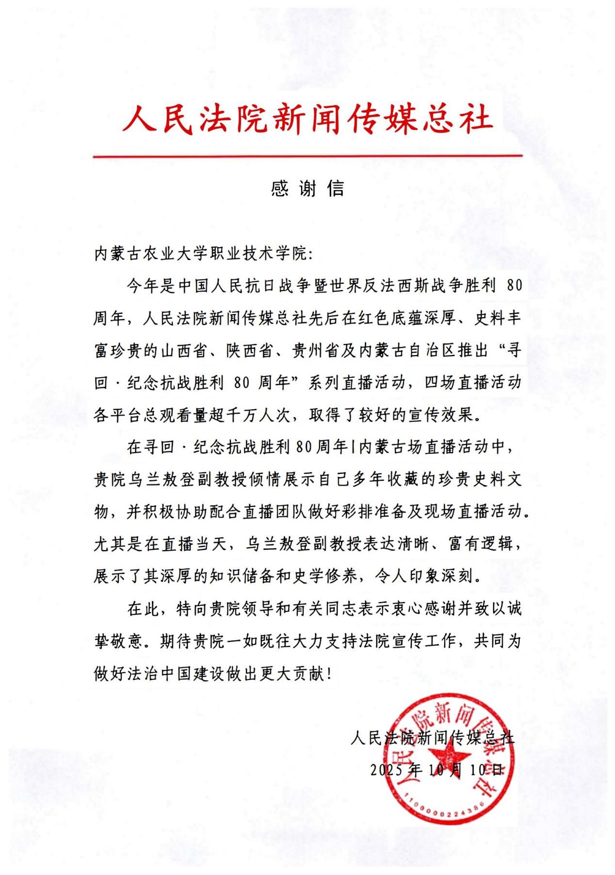 近日,人民法院新闻传媒总社发来感谢信,对我院乌兰敖登副教授在“寻回·纪念抗战胜利80周年”内蒙古场直播活动中的出色表现表达诚挚谢意。