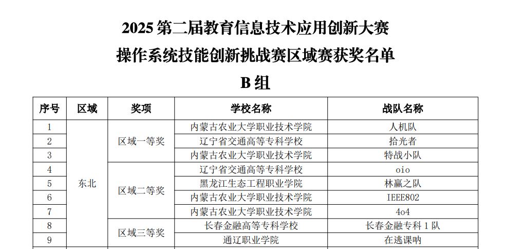 近日,由中国教育技术协会主办,浙江大学与中国教育技术协会网络安全专委会承办的2025年第二届教育信息技术应用创新大赛区域赛结果揭晓。由计算机技术系包永红、阮福、吴山丹老师指导的4支参赛队伍、11名学生积极参与了本次竞赛。学院学子展现出扎实的专业技能和良好的精神风貌,荣获东北赛区2项“一等奖”、2项“二等奖”,2个战队成功晋级全国总决赛。