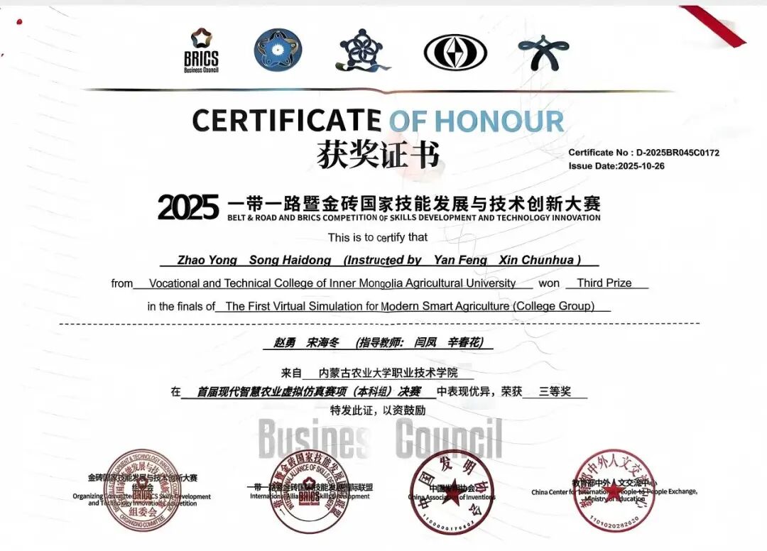 喜报丨我院计算机技术系学子斩获2025“一带一路”金砖大赛现代智慧农业虚拟仿真赛项全国三等奖