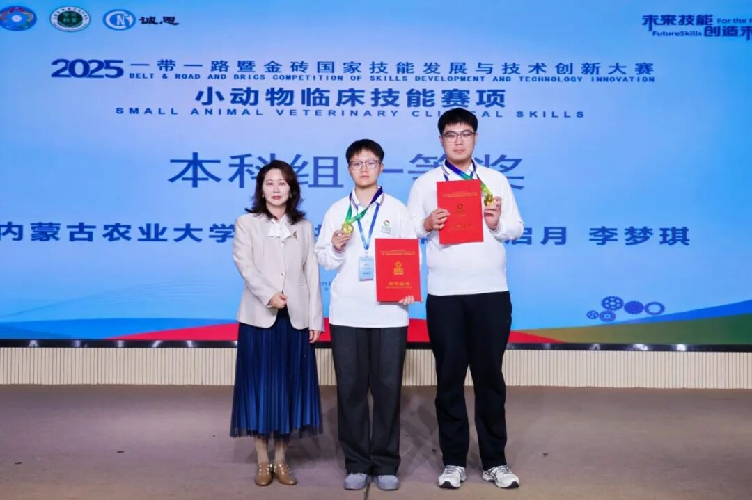 11月3日,2025“一带一路”暨金砖国家技能发展与技术创新大赛之小动物临床技能赛项决赛在上海农林职业技术学院圆满落幕。我院参赛团队凭借扎实的专业功底和精湛的实操技能斩获佳绩。本科组选手张启月、李梦琪以总分第一的成绩摘得本科组一等奖,专科组选手樊璐、盛世航荣获专科组优秀奖,指导教师葛海燕、哈登楚日亚获评“优秀指导教师”,我院同时获评“最佳组织奖”。