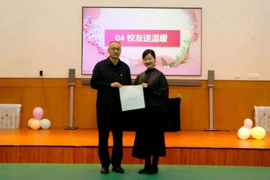饮水思源,情系母校。活动现场,学院2010届校友王冉冉作为校友代表上台发言,分享了爱心捐赠的初衷,并为学院全体女教职工赠送了服装优惠卡券以及精心准备的大礼包。这既是对学院40周年的献礼,也体现了校友对母校的眷恋与对女教职工的敬意。杨海升代表学院接受校友捐赠,郭海清为校友代表赠送锦旗,以此表达学院的诚挚谢意,这一温馨时刻也让现场洋溢着浓厚的校友情谊。